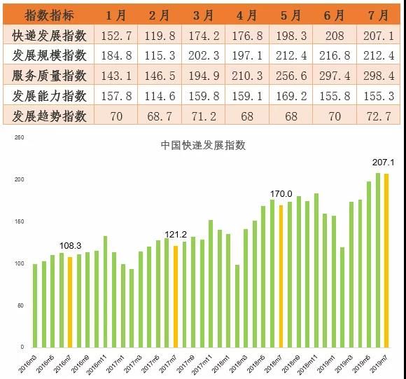 8月6日,国家邮政局发布2019年7月中国快递发展指数报告。据测算,2019年7月中国快递发展指数为207.1,同比提高21.8%,呈现稳中有进的态势。发展规模指数、服务质量指数和发展能力指数分别为212.4、298.4和155.3,分别比上年同期提高了27.6%、24.2%和17.6%,表明我国快递市场在发展规模、服务质量和发展能力方面整体提升。发展趋势指数为72.7,环比提高3.4%,连续两个月环比提升。
